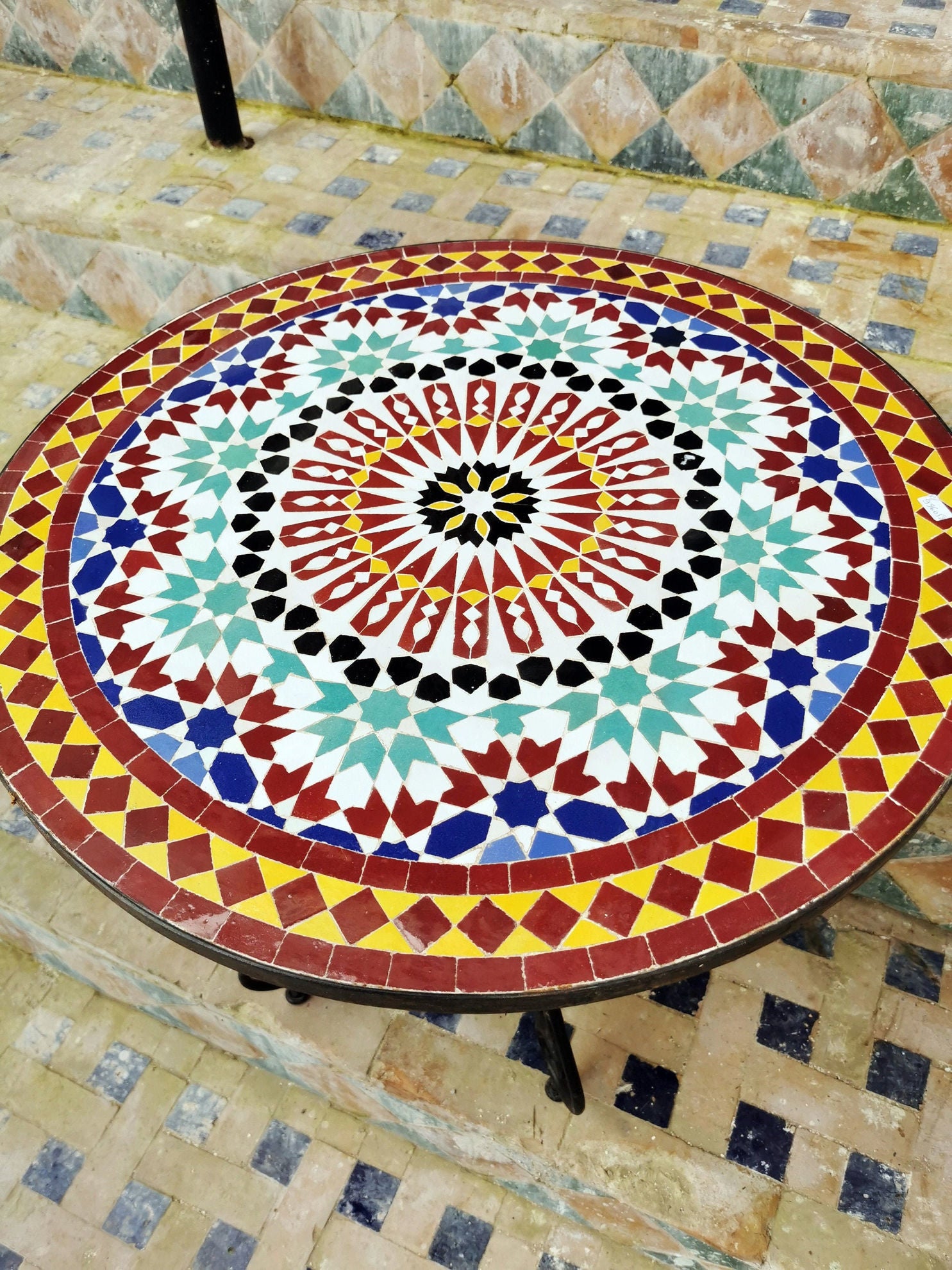 Handcrafted Moroccan outdoor mosaic tile table on iron base.