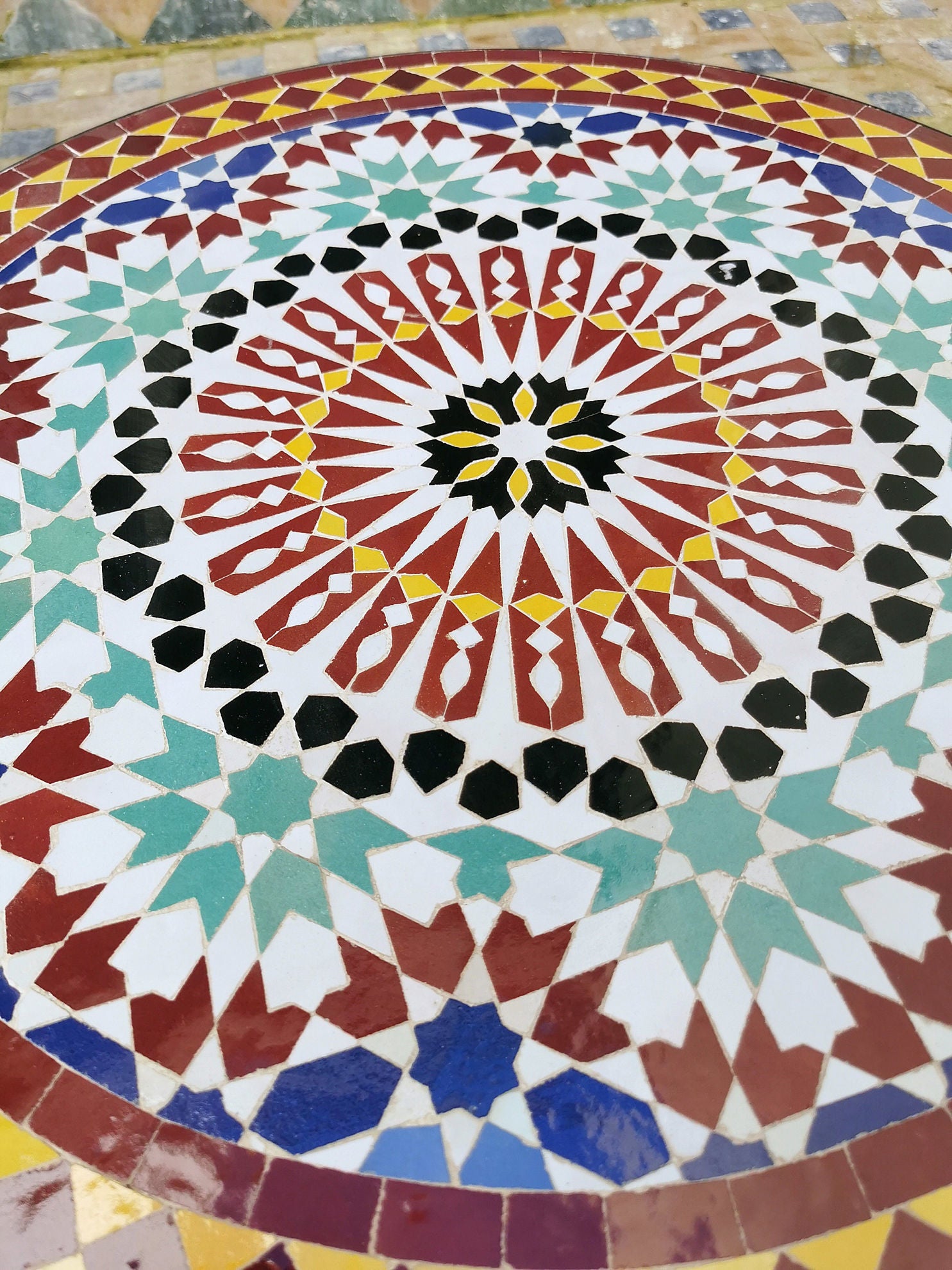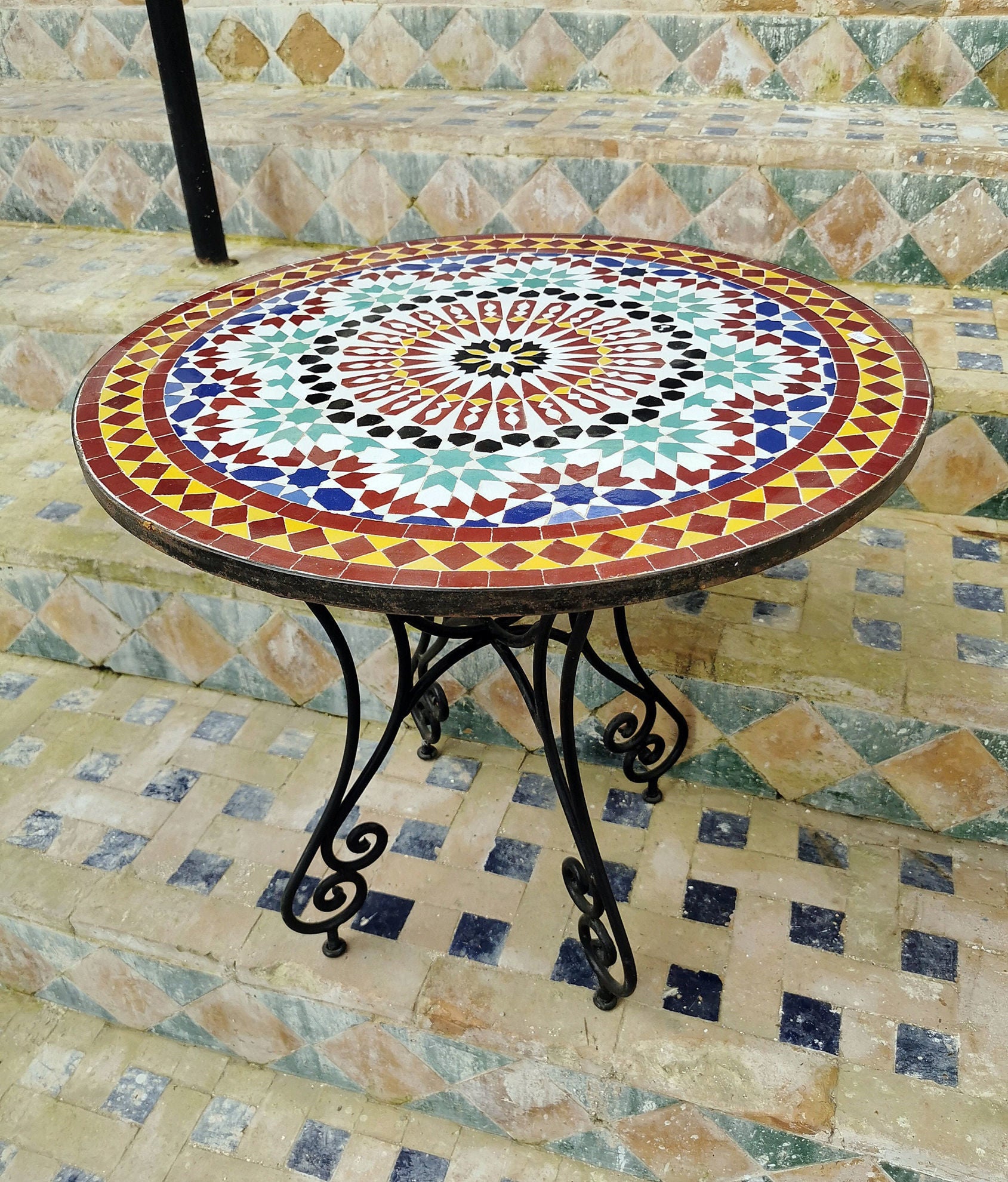 All our tile tabletops are imported and handcrafted in Morocco. The heavy Moroccan mosaic tile table tops just sit on the classic wrought iron table bases.