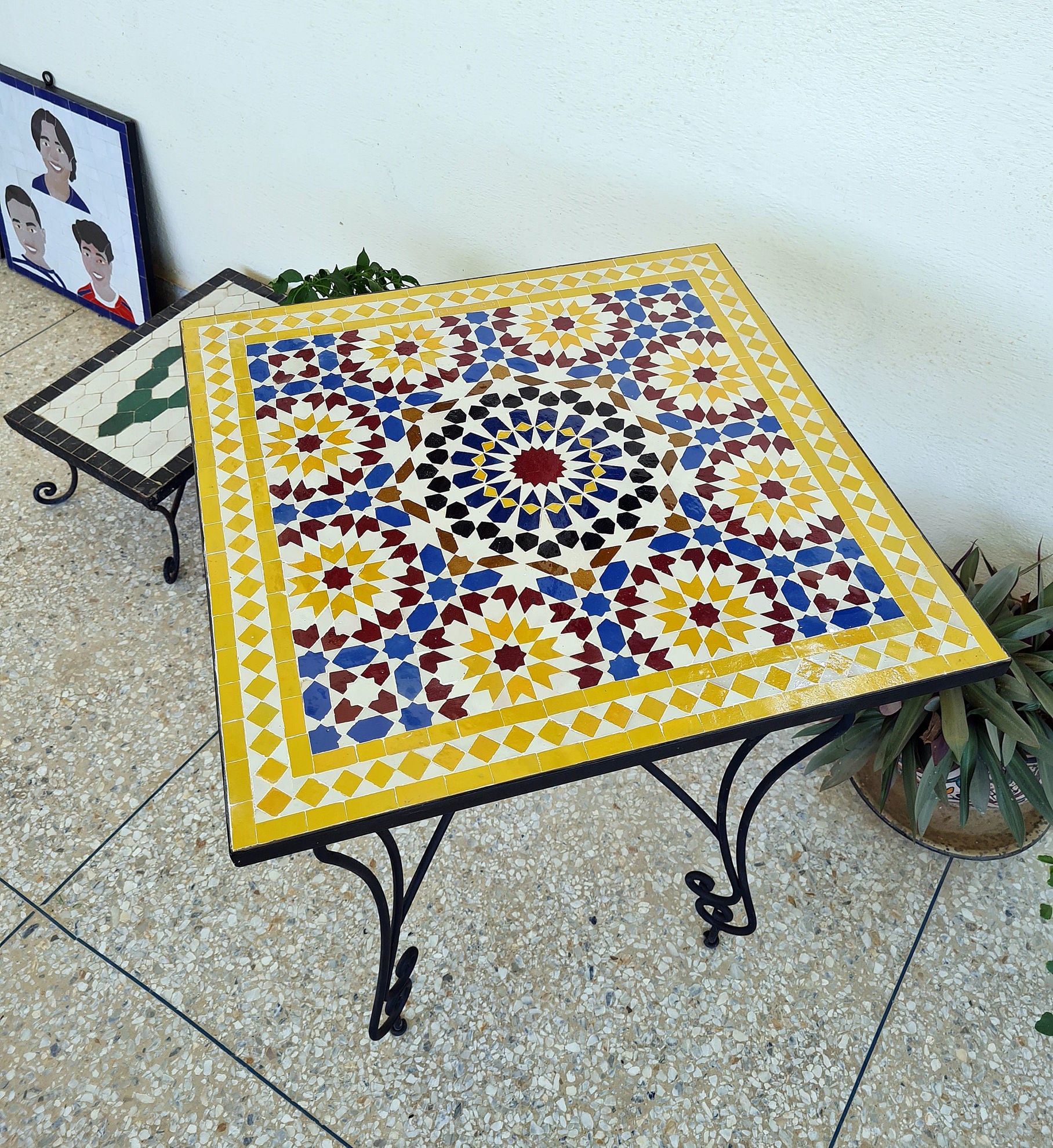 All our tile tabletops are imported and handcrafted in Morocco. The heavy Moroccan mosaic tile table tops just sit on the classic wrought iron table bases.
