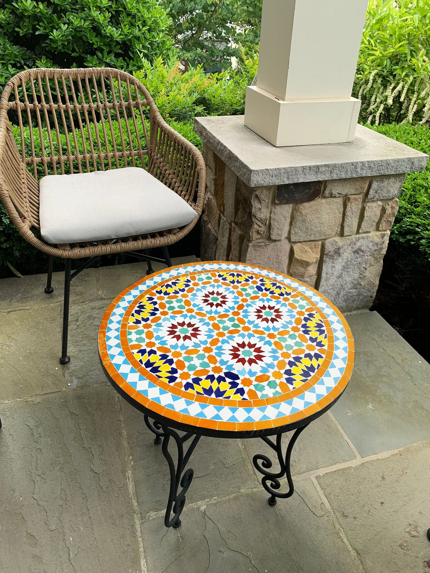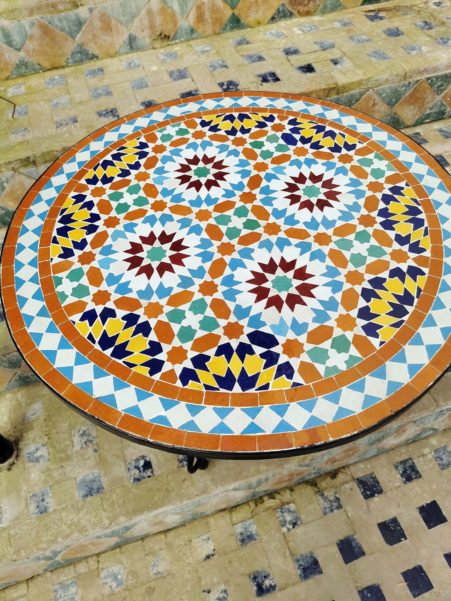 Our Moroccan Mosaic Tables could be used indoor or outdoor as patio furniture and garden furniture. They are sealed for easy care and need only to be wiped clean with a damp cloth.