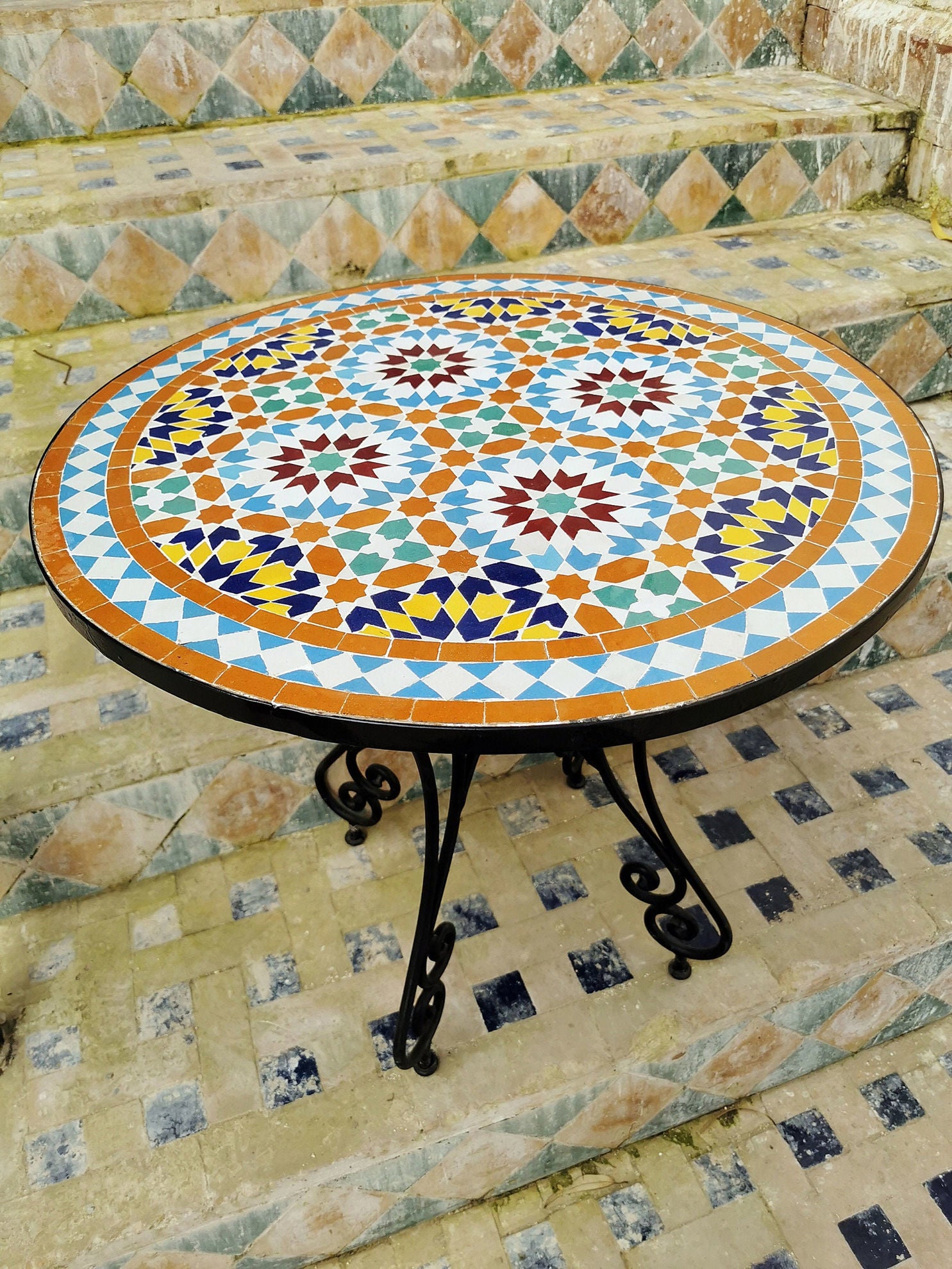 All our tile tabletops are imported and handcrafted in Morocco. The heavy Moroccan mosaic tile table tops just sit on the classic wrought iron table bases.