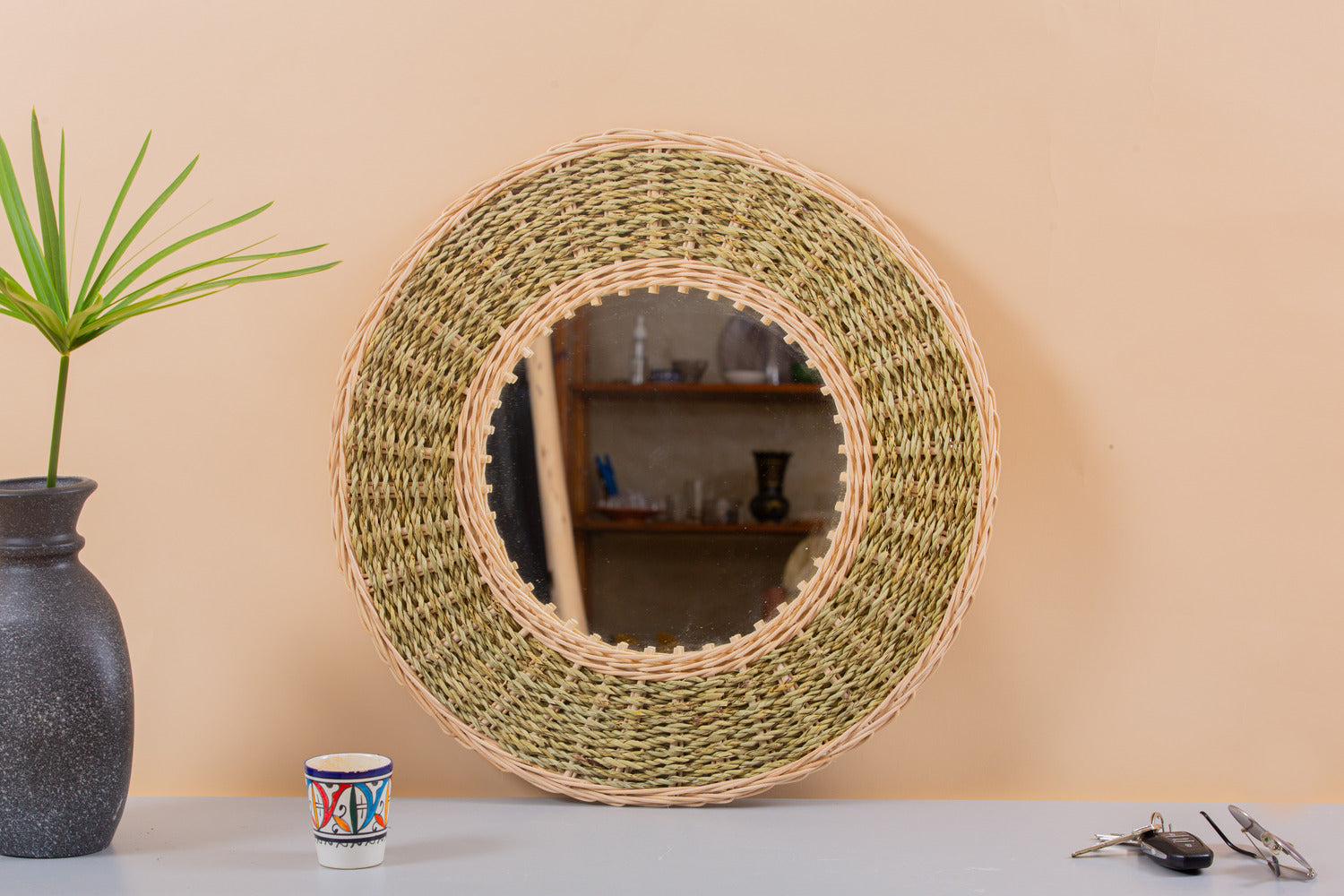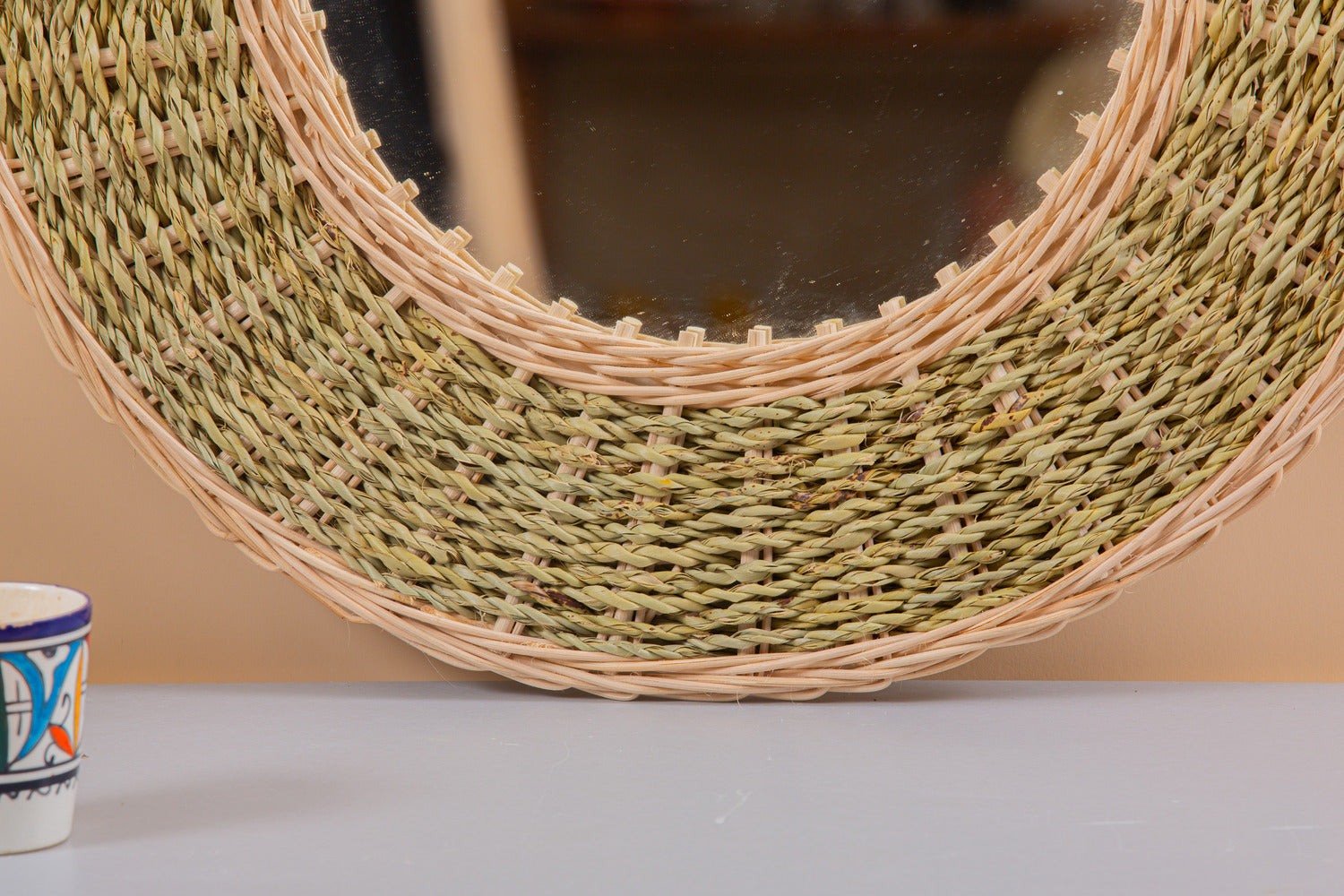 Raffia mirror handcrafted in Marrakech from 100% natural woven palm leaves. It highlights a creation to install outdoors or indoors in your living room. Ideal for boho chic decoration.